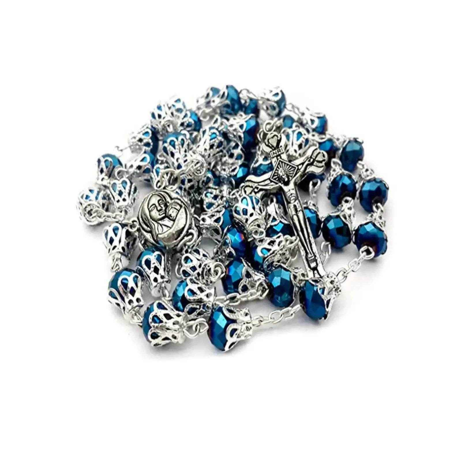Blue Crystallized Glass Beads Rosary Prayer Necklace Holy Soil Medal & Cross Crucifix