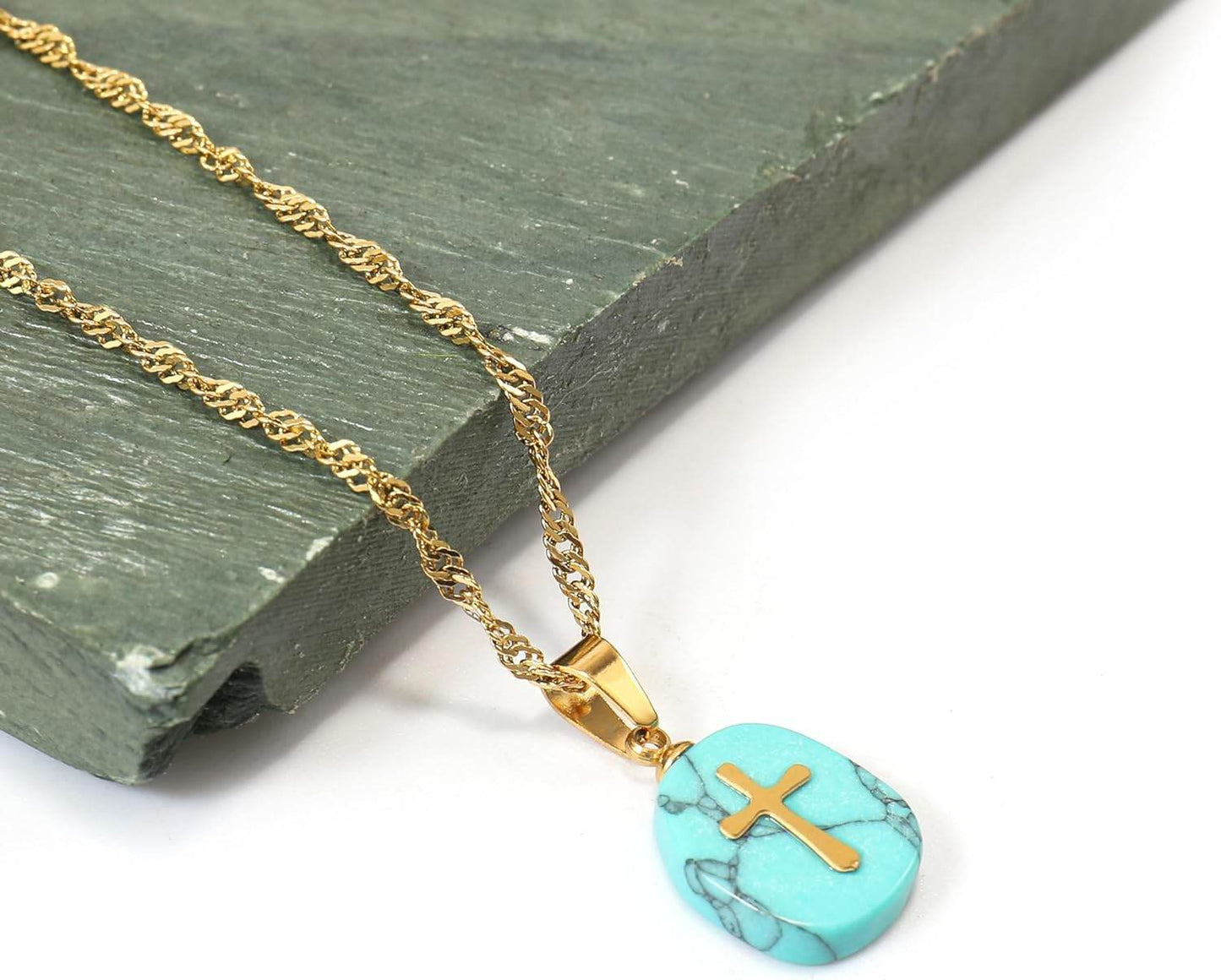 Natural Blue Sapphire Stone Cross Pendant Stainless Steel Clavicle Chain Necklace
