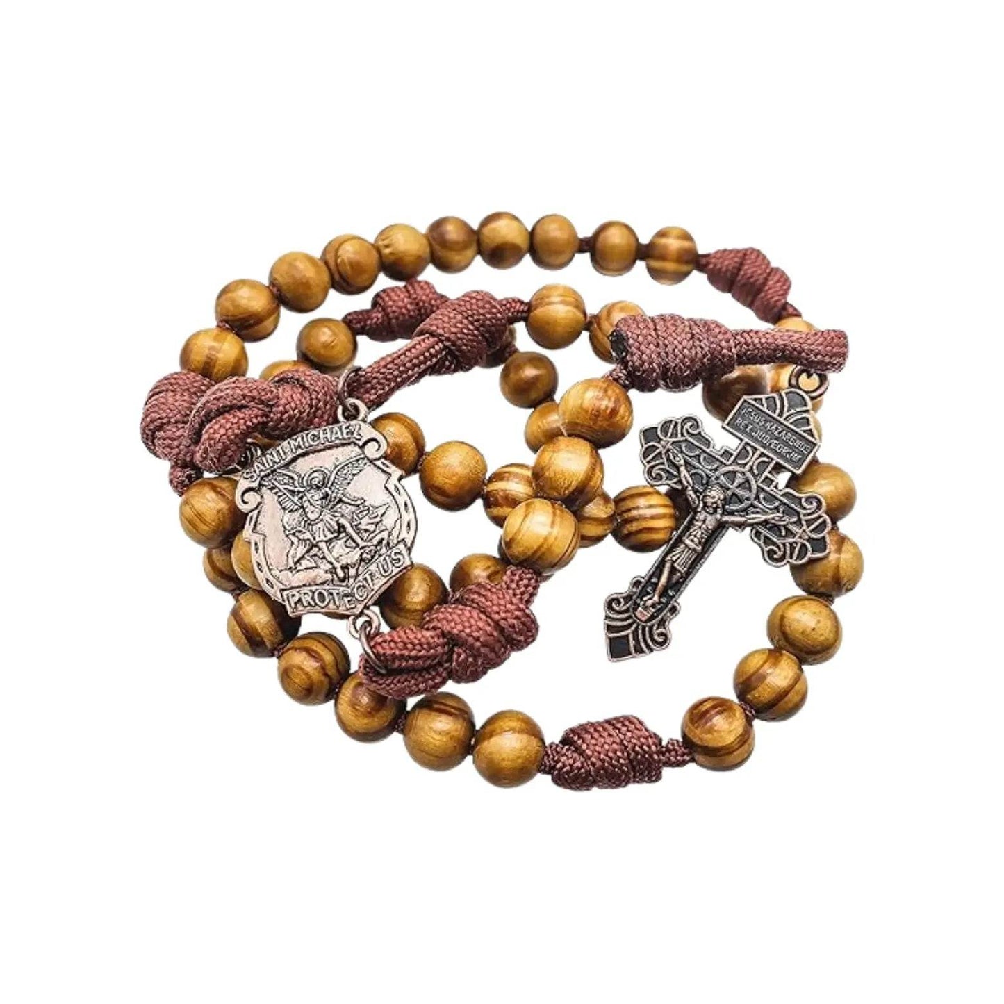 Rugged Cord Wooden Beads Paracord Rosary Necklace Red Bronze St Michael Medal